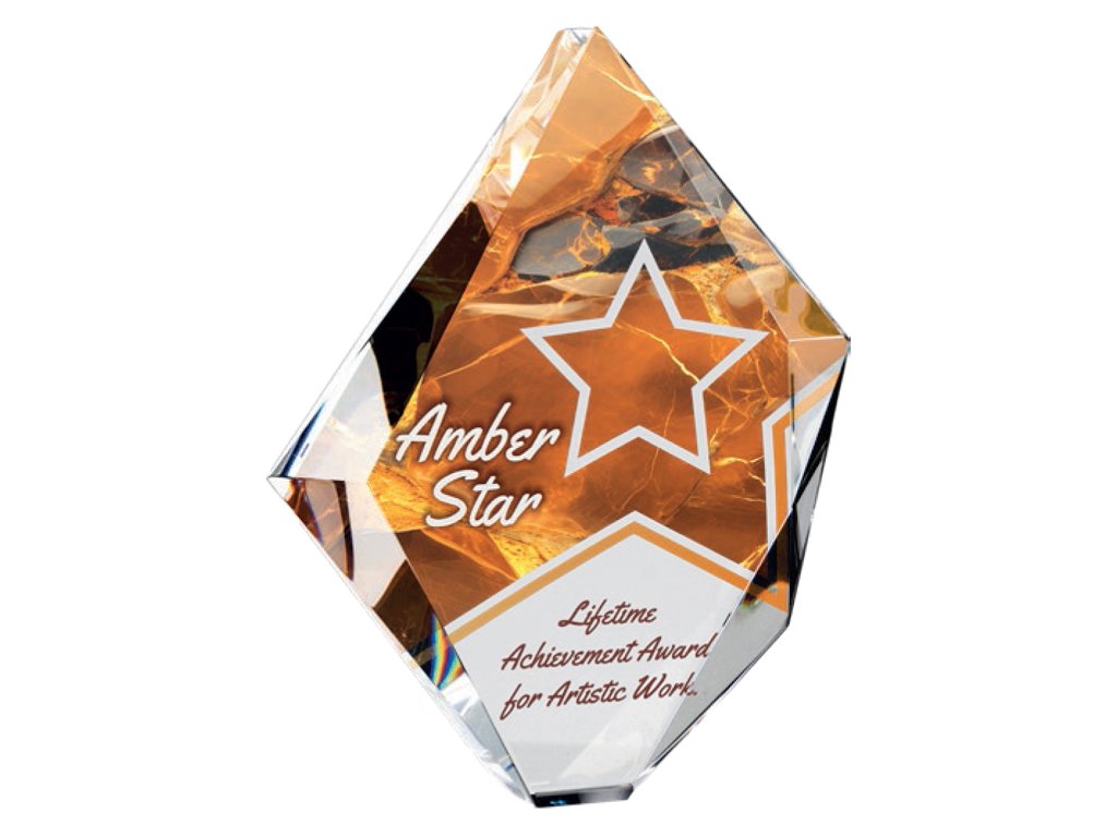 Sklenená trofej v kazete určená pre gravírovanie alebo farebnú potlač. Výška trofeje: 19,5 cm.