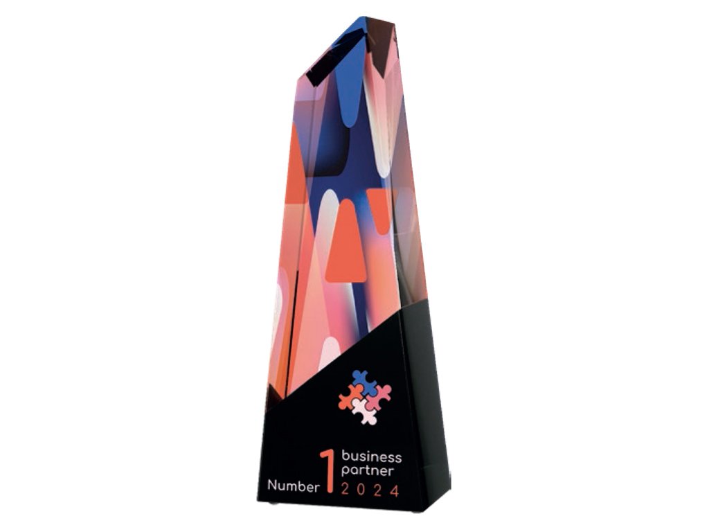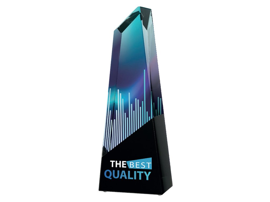 Sklenená trofej určená pre gravírovanie alebo farebnú potlač. Možnosť gravírovania (sklo a podstavec) alebo kombinácia potlače skla s gravírovaním podstavca. Gravúru je možné farebne zvýrazniť farbami z našej ponuky. Výška trofeje: 28,5 cm.