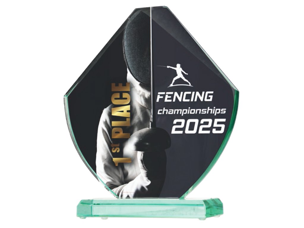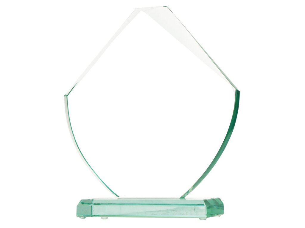 Sklenená trofej v kazete určená pre gravírovanie alebo farebnú potlač. Výška trofeje: 23,5 cm.