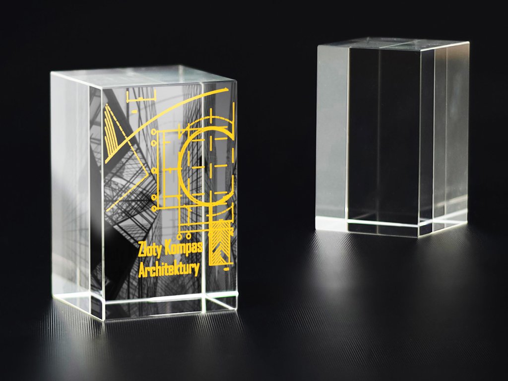 Sklenená trofej v kazete určená pre gravírovanie a farebnú potlač. Veľkosť trofeje 8 x 5 x 5 cm.