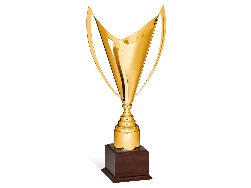 Zlatý kovový pohár na drevenom podstavci na ktorý je možné umiestniť štítok s textom.