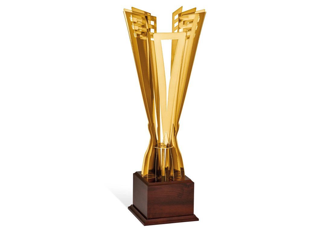 Zlatý kovový pohár na drevenom podstavci na ktorý je možné umiestniť štítok s textom.