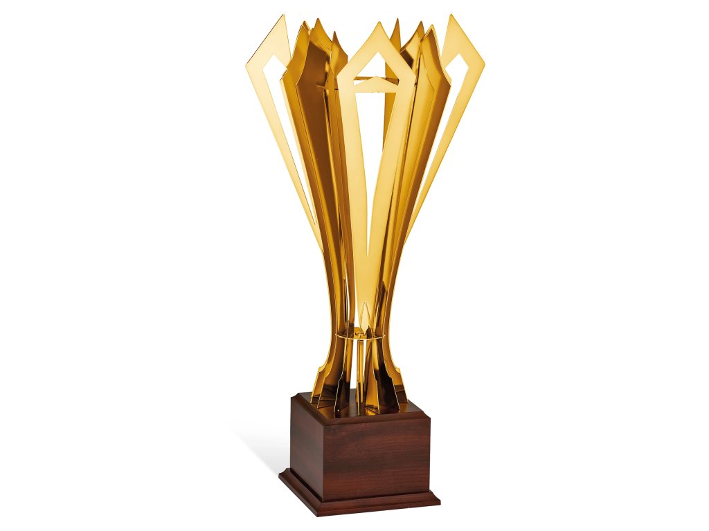 Zlatý kovový pohár na drevenom podstavci na ktorý je možné umiestniť štítok s textom.