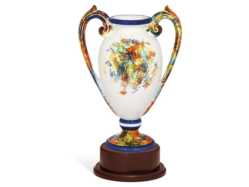 Keramický pohár na drevenom podstavci.
